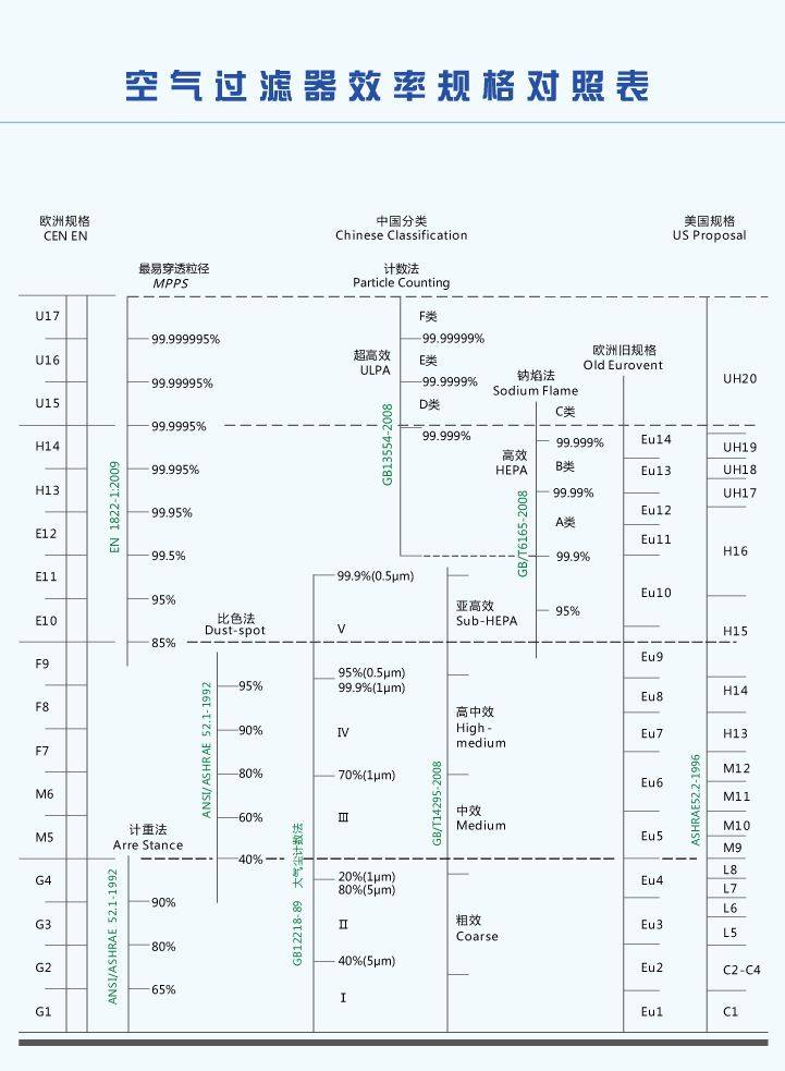> Air filter efficiency specification comparison table